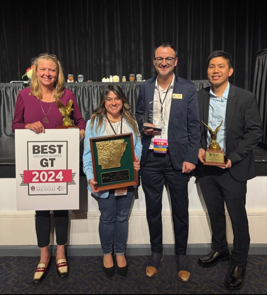 Sarah McKenzie, Ashley Rieske, Dustin Seaton, and Jonathan Wai, award winners recognized by Arkansans for Gifted and Talented Education (AGATE) at the 2025 conference in Hot Springs, AR.